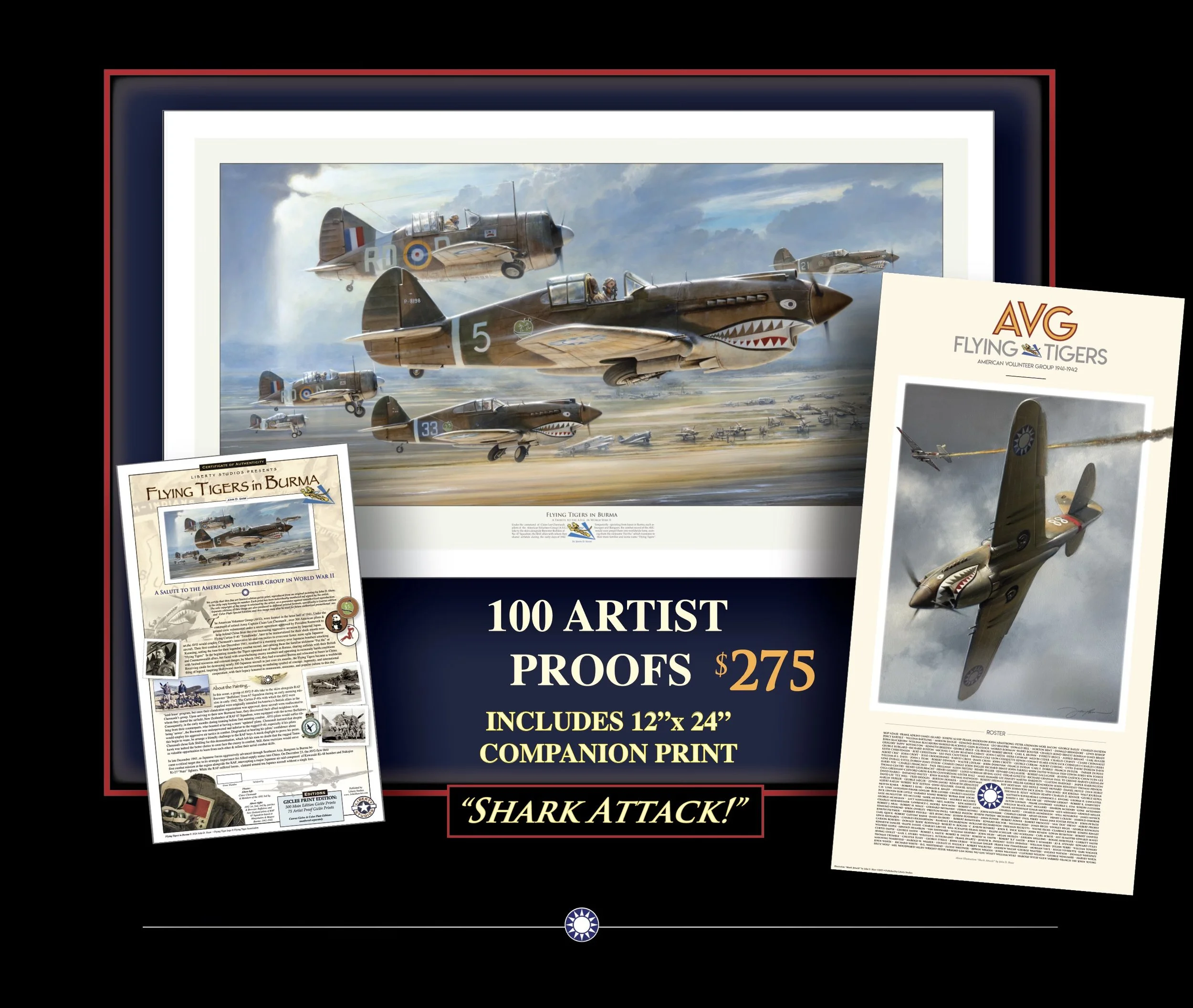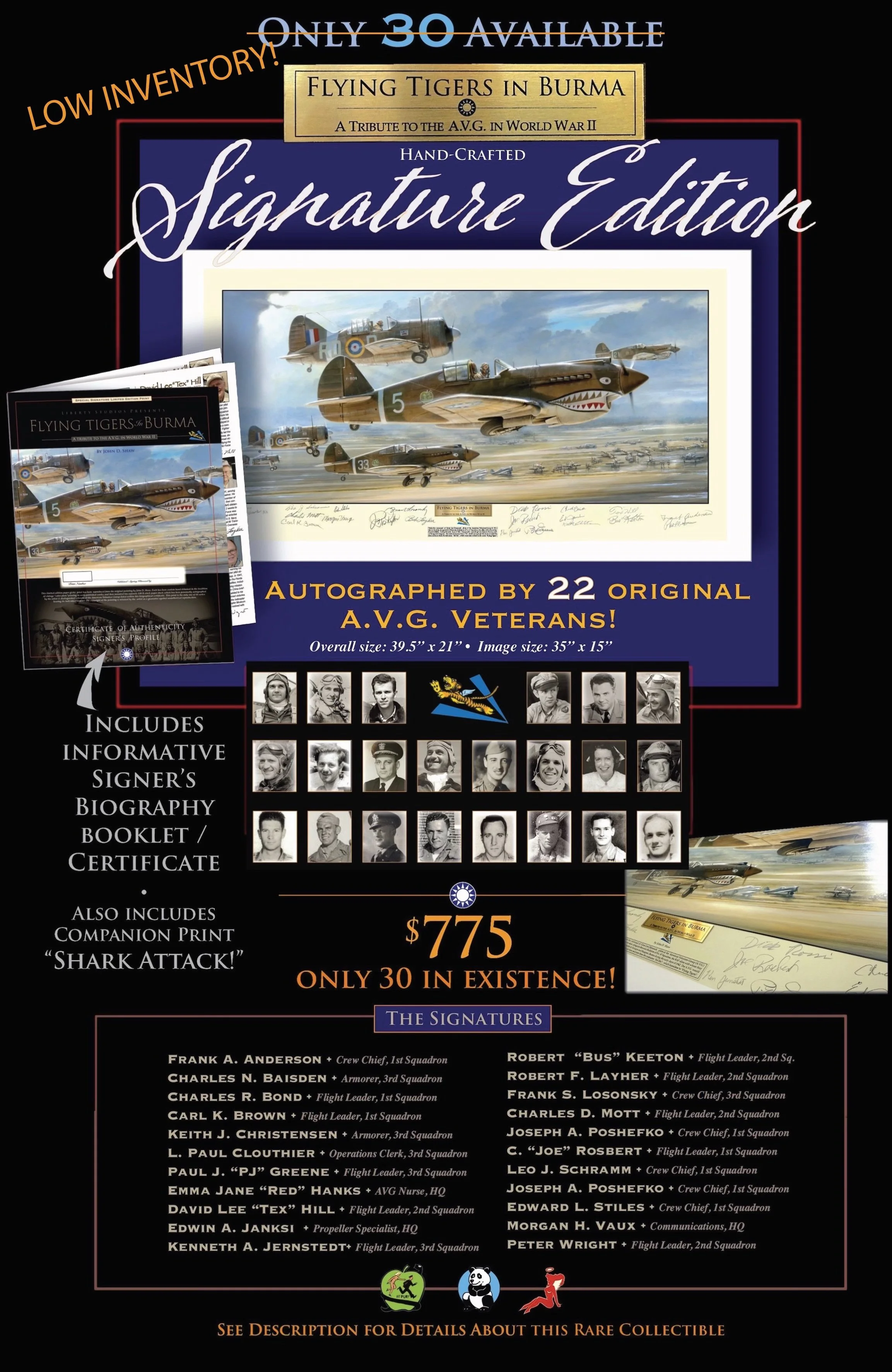 In 2004, members of the AVG gathered to sign lithographs of John Shaw’s Summer of ’42 in Orlando, Florida. A small number of these signed prints were later found to have some printer’s flaws in the main image, but the prints & signatures have remained un-numbered in flawless condition and stored for over two decades. Rather than discarding these valuable pieces of history, beautiful archival paper giclée overlays of Flying Tigers in Burma have been produced and permanently mounted on them, creating a whole new, unique archival print, likely the last time a new print will ever come available with a sizable quantity of wonderful AVG veteran signatures.