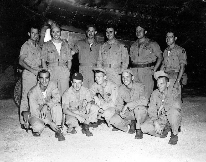 Standing, back row: Lt. Col John Porter (ground maintenance officer), Capt. Theodore J. "Dutch" Van Kirk, navigator; Major Thomas W. Ferebee, bombardier; Col. Paul W. Tibbets, pilot; Capt. Robert A. Lewis, co-pilot; and Lt. Jacob Beser, radar countermeasure officer.