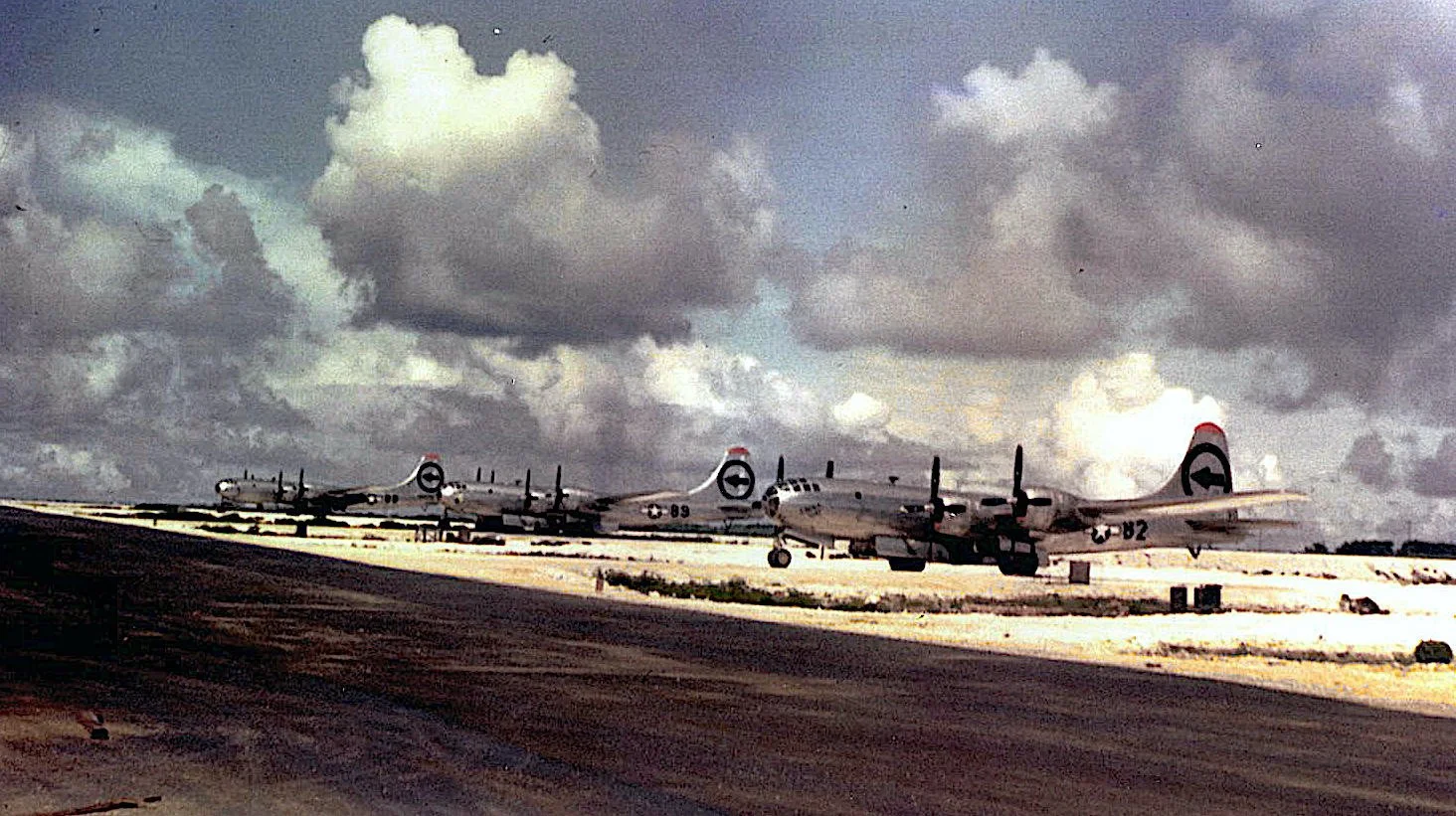 Tinian Island, August 1945, home of the 509th Composite Group. Approximately 1,500 miles from mainland Japan, after being seized by the Allies late July, Tinian became the main staging base for continuous heavy bomber attacks on the Japanese Islands. Shown here is a lineup of “Silverplate” B-29s, with Enola Gay in the foreground. Aircraft of the 509th bore the tail marking of a large circle & arrowhead. These markings would be repainted temporarily with emblems from other Pacific bomb groups in the vicinity just prior to the atomic missions, to confuse the ever-watchful enemy.