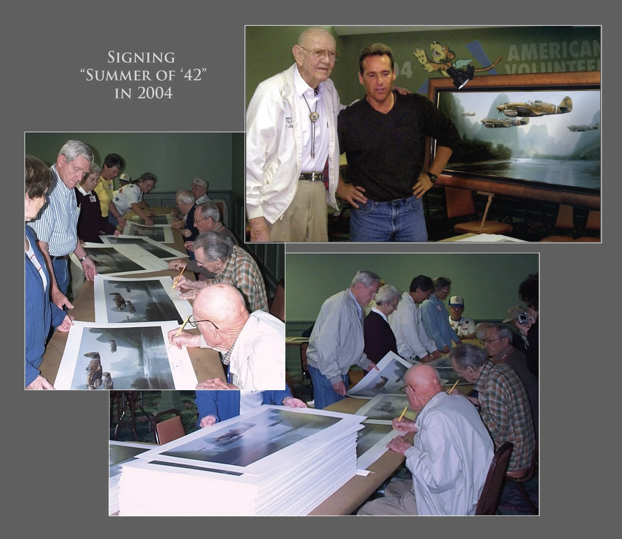 In 2004, I’d completed the painting Summer of ’42 and a print was produced, which a group of about 18 AVG veterans signed during their reunion in Orlando, Florida. During the labor-intensive process of autographing over 1000 prints, many fun moments and memories are heard, and afterward, all signers and helpers share a great sense of accomplishment. (In the photo, Yours Truly is standing with Tex in front of the oil painting, and the lower two pics show the signing ‘assembly line’).